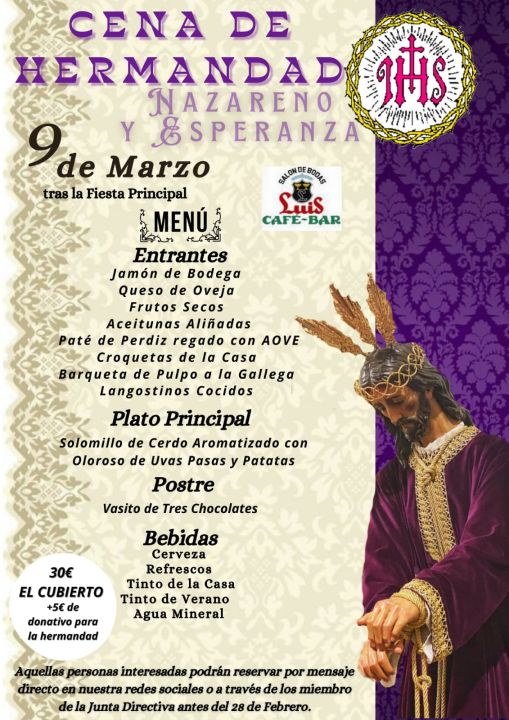 El próximo día 9 de Marzo, tras la finalización de la Fiesta Principal de la Cofradía de Nuestro Padre Jesús Nazareno, tendrá lugar una Cena de Hermandad en el Salón de Bodas Café Bar Luis.