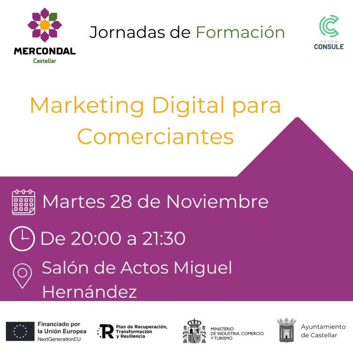 El próximo día 28 de Noviembre, martes, tendrá lugar en el Ayuntamiento de Castellar una de las sesiones de las Jornadas de Formación de Mercondal, dirigidas principalmente a comerciantes de Castellar. En esta ocasión el tema a tratar será el "Marketing Digital para Comerciantes"