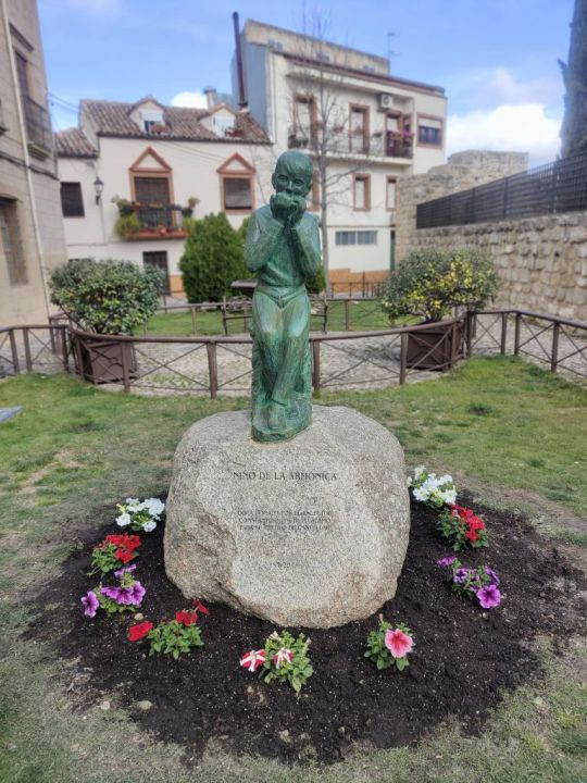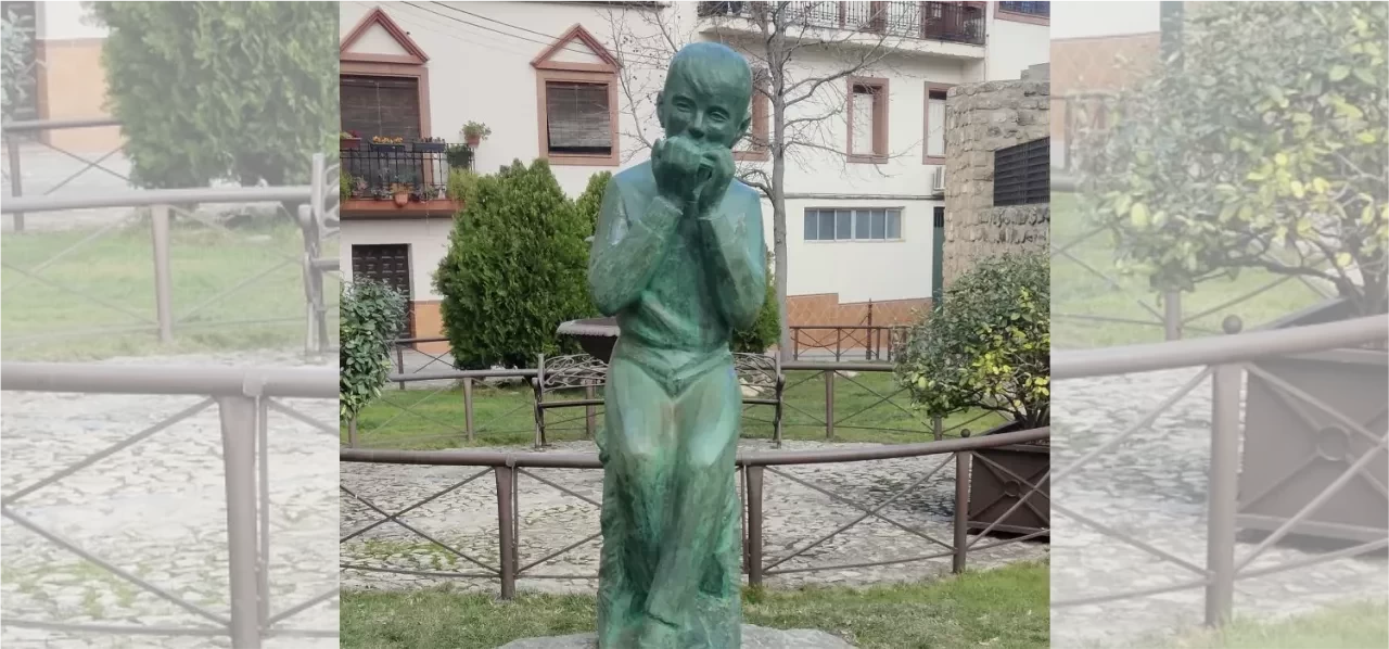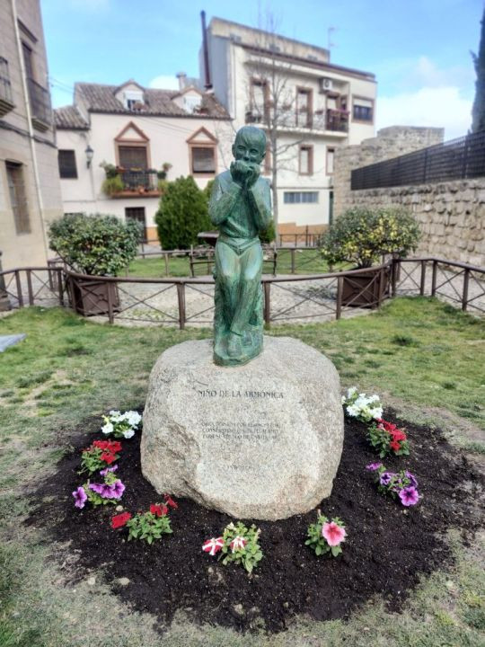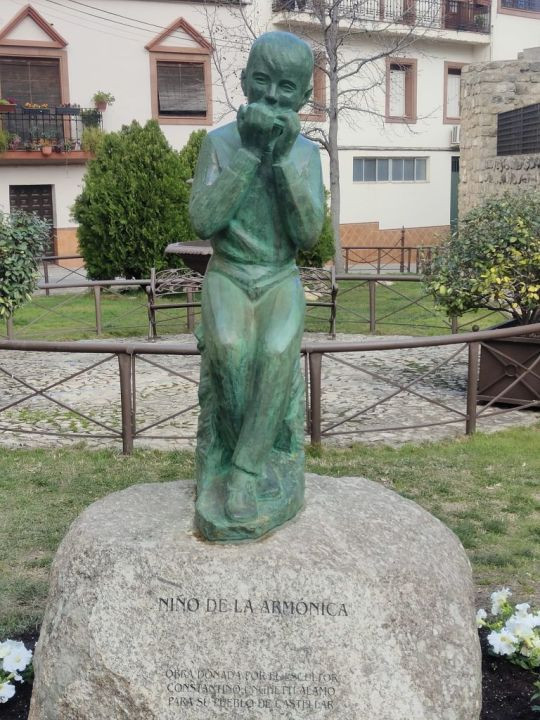 La estatua de bronce del niño de la armónica ya luce en su parque
