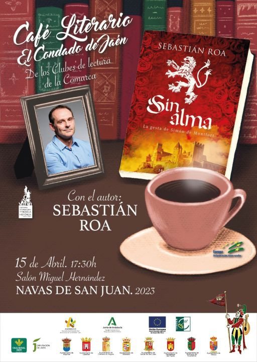 El próximo Café Literario El Condado de Jaén, de los clubes de lectura de la comarca, tendrá lugar el próximo sábado 15 de abril de 2023, en el Salón Miguel Hernández de Navas de San Juan, y donde el escritor Sebastián Roa presentará su última novela "Sin alma. La gesta de Simón de Montfort".
